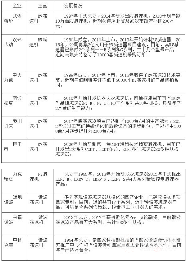 可以看出,目前國內主要的減速機企業成立時間都不短,都有一定的歷史積累,但減速機技術上取得突破都在近幾年,一方面是技術要求比較高,需要一定的技術積累,另一方面則是由于近年來國內工業機器人整體市場的發展讓企業看到了減速機發展前景,也加了大了投入力度。