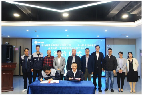 簽約儀式上,邁雷特總顧問肖利偉與中山職業(yè)技術(shù)學(xué)院付林處長共同簽署“五面體數(shù)控龍門加工中心”合作共研協(xié)議。