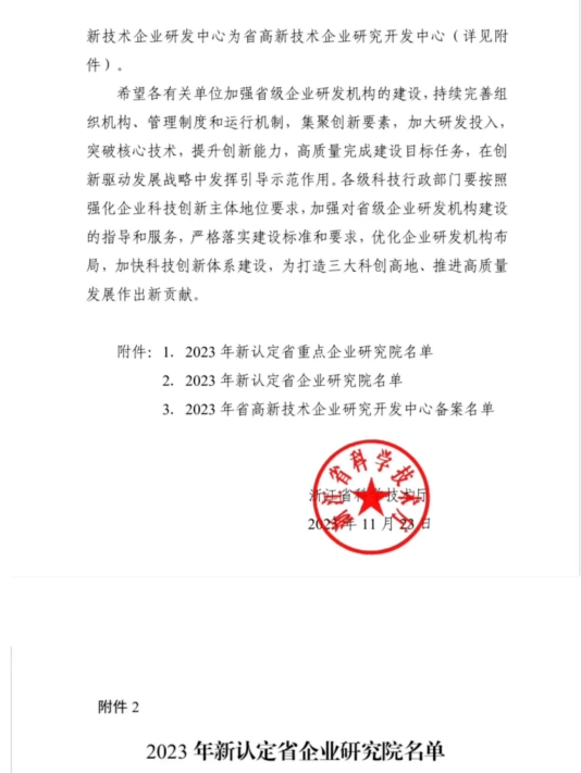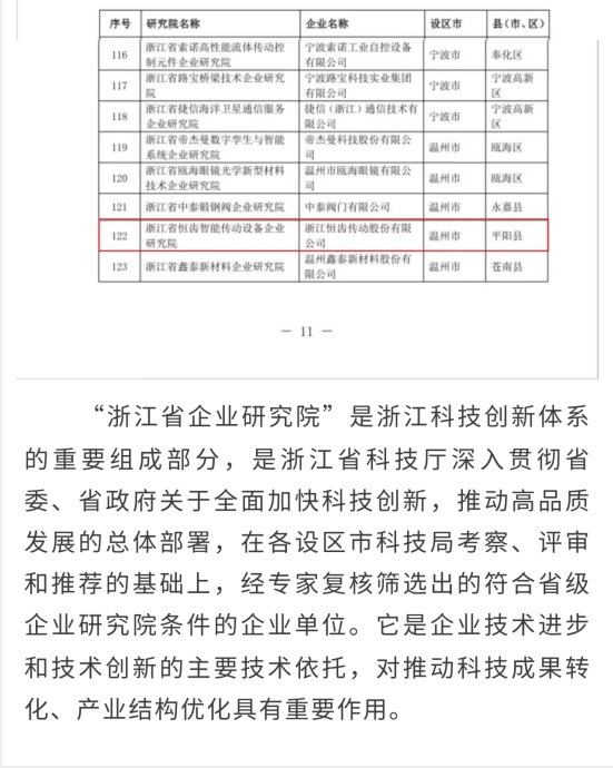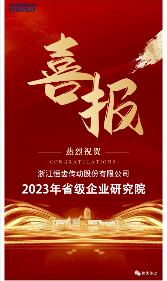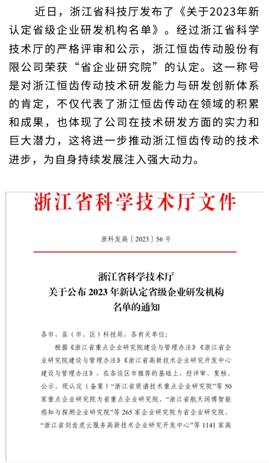 浙江恒齒傳動(dòng)股份有限公司榮獲2023年省級企業(yè)研究院。