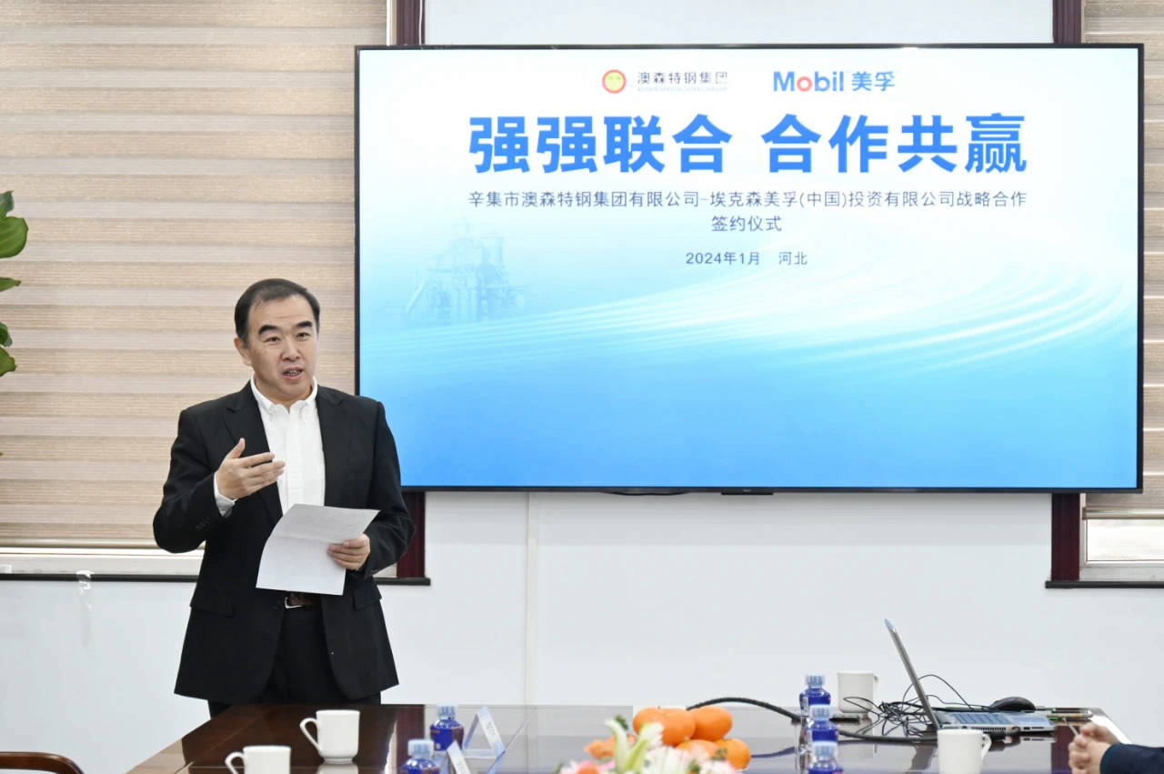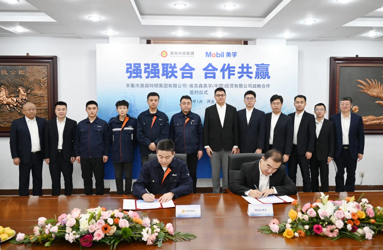 2024年1月16日,河北辛集——近日,埃克森美孚(中國)投資有限公司(簡稱 “埃克森美孚中國” )和辛集市澳森特鋼集團有限公司(簡稱 “澳森特鋼集團” )在澳森特鋼集團總部成功簽署全面戰略合作框架協議。雙方將利用各自領域的專業能力和技術優勢,進一步強化在潤滑產品、服務和管理方面的合作。