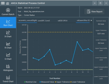 SPC(統(tǒng)計(jì)過程控制):ANCA 經(jīng)過改進(jìn)的 SPC 軟件使用戶能夠在大批量生產(chǎn)過程中對(duì)生產(chǎn)流程進(jìn)行全面控制。主要功能包括:
