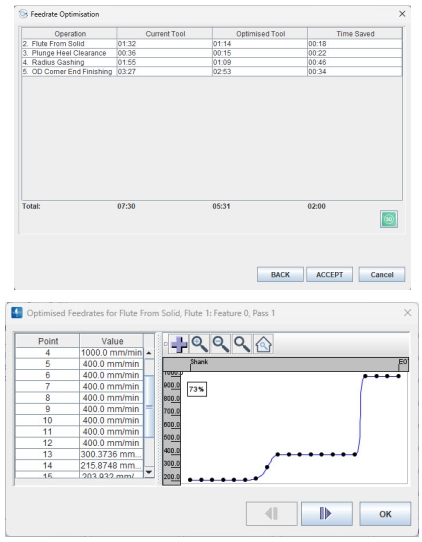 進(jìn)給速度優(yōu)化:RN35 包括進(jìn)給速度優(yōu)化功能,可確保縮短加工周期并提高生產(chǎn)率。該軟件有助于獲得穩(wěn)定的刀具質(zhì)量和出色的表面光潔度,從而提高數(shù)控刀具制造的性能。