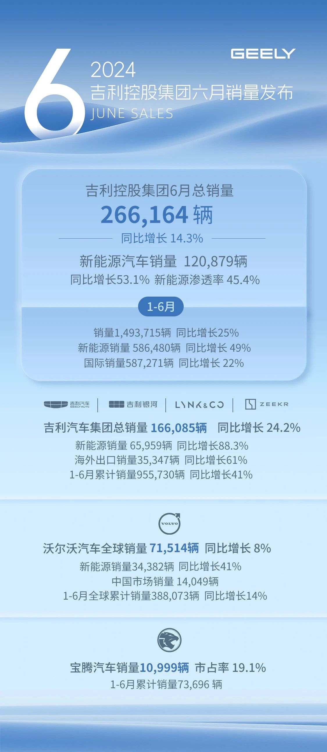 吉利控股集團6月總銷量266164輛,同比增長14.3%。