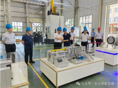 上午9時許,陳吉紅董事長一行來到長沙思勝,實地走訪了長沙思勝生產車間和加工零件展示區,觀看并交流探討了長沙思勝高端數控榫槽拉床研發進度情況。