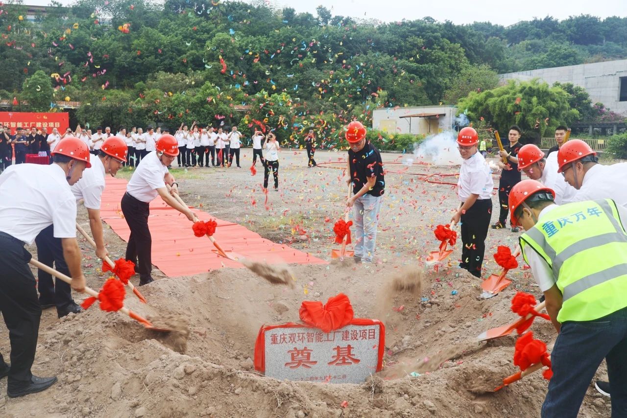 9時16分,奠基儀式迎來了最激動人心的環節——培土儀式。現場禮炮齊鳴、掌聲雷動,各位領導及嘉賓揮動金鏟,共同為項目奠基培土。培土儀式順利完成,標志著重慶雙環智能工廠建設項目正式破土動工,重慶雙環邁上新的發展里程。