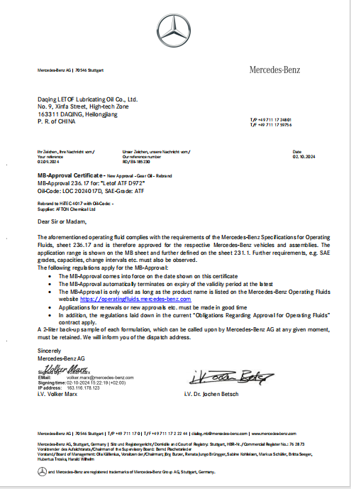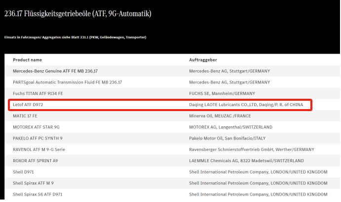 為了滿足國內奔馳9速變速箱車型的換油保養需求,勞特潤滑油務實發展,成功研發出滿足此變速箱的油品Letof ATF D972,以更好的氧化安定性和熱安定性等性能指標,完全滿足MB 236.17標準要求,順利通過認證考核。勞特潤滑油追求品質,創新發展。未來,我們將提供更多的創新解決方案,憑借高品質的經營理念和嚴格的生產流程管控,使客戶在市場上得到更多的認可和優勢,讓挑戰者更有信心。