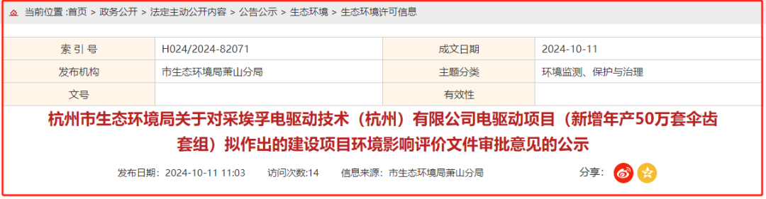 10月11日,杭州市生態環境局蕭山分局公示了“關于對采埃孚電驅動技術(杭州)有限公司電驅動項目(新增年產50萬套傘齒套組)擬作出的建設項目環境影響評價文件審批意見”。公示期為5個工作日。