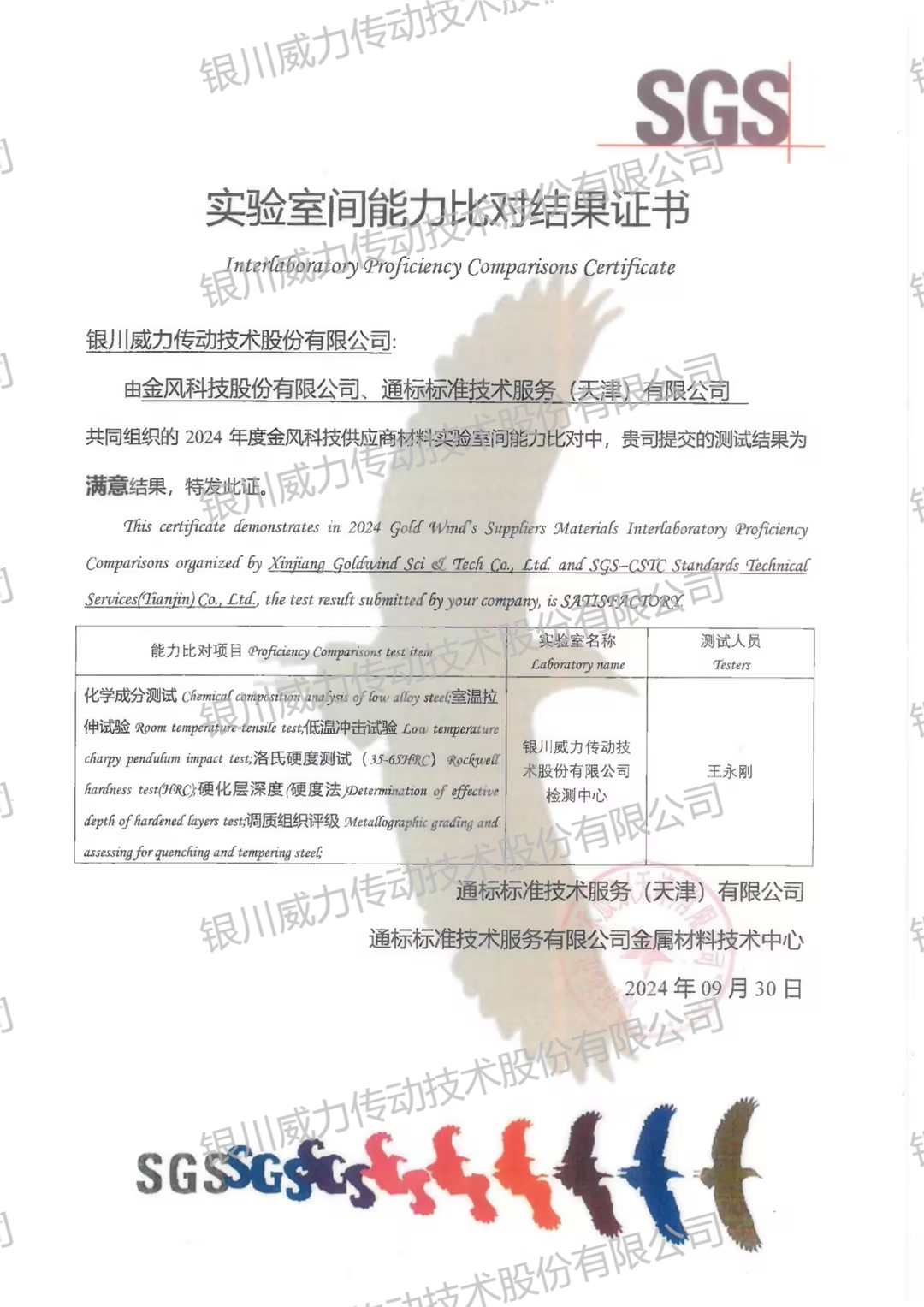 近日,銀川威力傳動技術股份有限公司(簡稱“威力傳動”)檢測中心傳來喜訊,經過一系列嚴格、公正的測試和評估,檢測中心已成功通過國際知名檢測認證機構SGS的實驗室能力比對,這一重要里程碑不僅標志著威力傳動的檢測技術和服務水平達到了國際先進標準,也再次證明了威力傳動在行業內的領先地位和卓越品質。