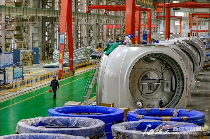 11月8日,中船海裝新疆海裝風電設備有限公司風機制造車間,工作人員在裝配風電設備。