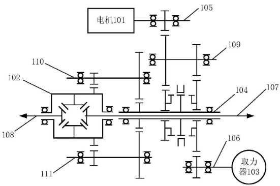 專利摘要:本申請公開了一種電驅橋減速器。該電驅橋減速器包括:電機、差速器、取力器及軸系;軸系的中間軸組中的第一中間軸和第二中間軸設置在軸系中的中心軸的同側,中間軸組中的第二中間軸和第三中間軸設置在中心軸的兩側;電機與取力器分別設置在中心軸的兩側;中心軸空套在軸系的動力輸出軸組中的第一輸出半軸上,并通過第二中間軸和第三中間軸與差速器相連接;差速器分別與第一輸出半軸和動力輸出軸組中的第二輸出半軸連接;取力器通過軸系的取力器輸出軸與中心軸連接。本申請技術方案通過將電機、軸系、取力器設置在動力輸出軸組的中心線兩側,解決了現有技術將減速器集成到橋殼之后由于電驅橋整體受力不佳,導致電驅橋的承載能力較低的問題。