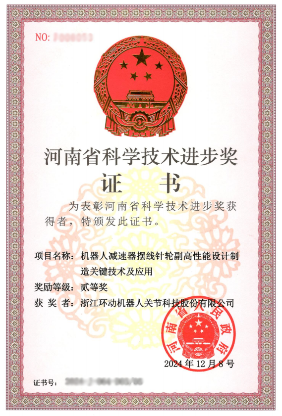 2024年12月9日,省委、省政府在鄭州隆重舉行全省科學技術獎勵大會,對2024年度省科學技術獎獲獎者進行表彰。環(huán)動科技參與的《機器人減速器擺線針輪副高性能設計制造關鍵技術及應用》項目,榮獲2024年度河南省科學技術進步獎二等獎。