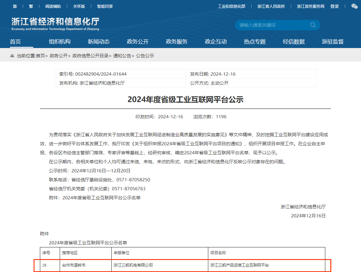 近日,浙江省經(jīng)濟和信息化廳公示2024年度省級工業(yè)互聯(lián)網(wǎng)平臺名單,“浙江三凱產(chǎn)品運維互聯(lián)網(wǎng)平臺”項目成功入選!