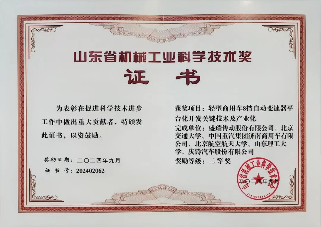 12月21日,山東省機械工業(yè)協(xié)會在濟南頒發(fā)2024年度山東省機械工業(yè)科學技術(shù)獎,盛瑞“輕型商用車8擋自動變速器平臺化開發(fā)關(guān)鍵技術(shù)及產(chǎn)業(yè)化”榮獲山東省機械工業(yè)科學技術(shù)獎二等獎。