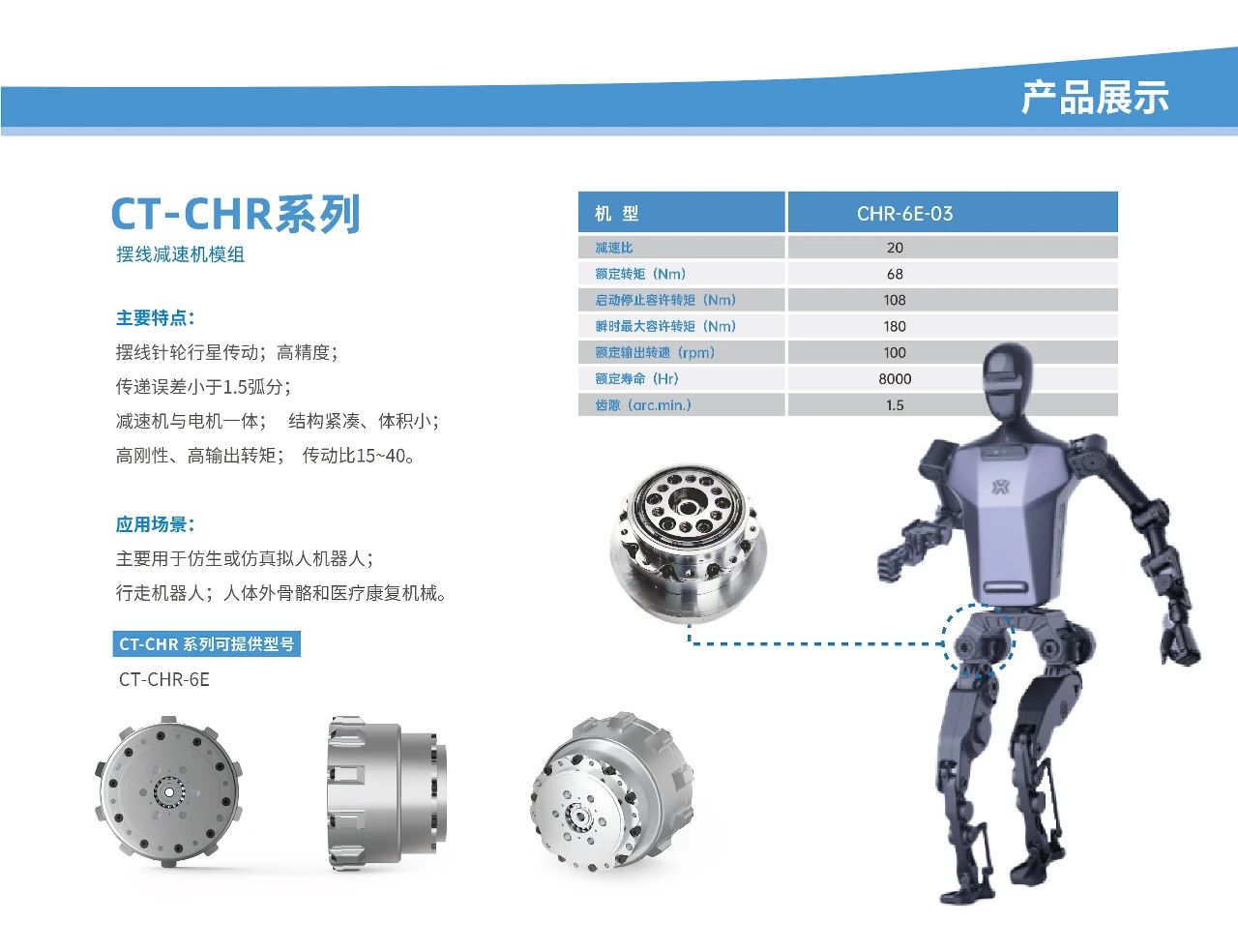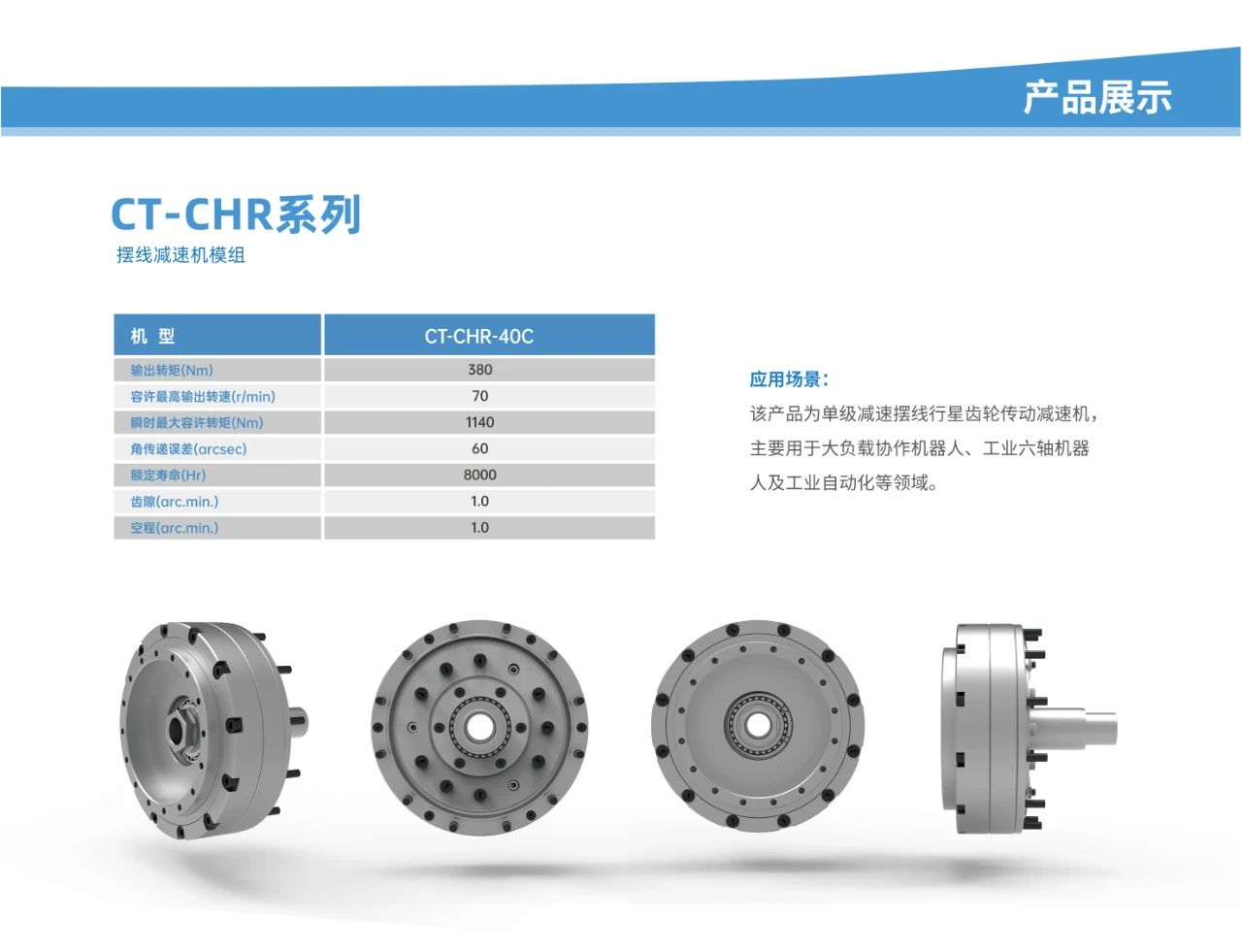 同時,在2024年的高工年會展臺上,智同科技再次展示了CT-CRV系列工業機器人關節用高精密減速機和CT-HYP系列準雙齒輪傳動關節模組兩系列產品,另外,首次展出CT-CHR系列擺線減速機模組CT-CHR-6E和CT-CHR-40C兩個型號產品,這些展品以其卓越的性能和創新技術獲得了與會同行的廣泛關注。