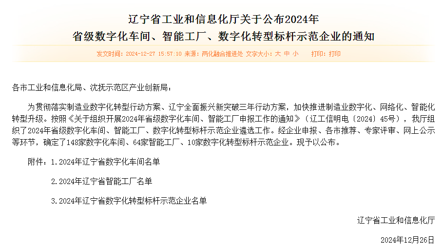 12月26日,遼寧省工業(yè)和信息化廳發(fā)布《2024年省級數(shù)字化車間、智能工廠、數(shù)字化轉(zhuǎn)型標(biāo)桿示范企業(yè)名單》,通用技術(shù)沈陽機(jī)床獲評2024年省級智能工廠、數(shù)字化轉(zhuǎn)型標(biāo)桿示范企業(yè),標(biāo)志著公司在推進(jìn)制造業(yè)數(shù)字化、網(wǎng)絡(luò)化、智能化方面取得了顯著成效。