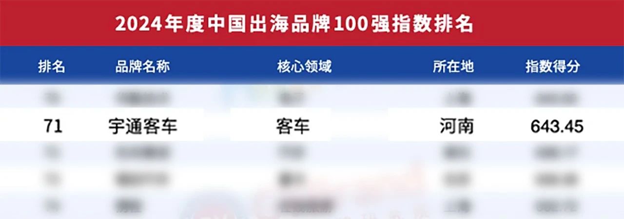 近日,由人民日報和GYBrand全球品牌研究院聯合編制發布的《中國出海品牌100強指數》榜單出爐,宇通客車成為客車領域唯一獲此殊榮的企業。