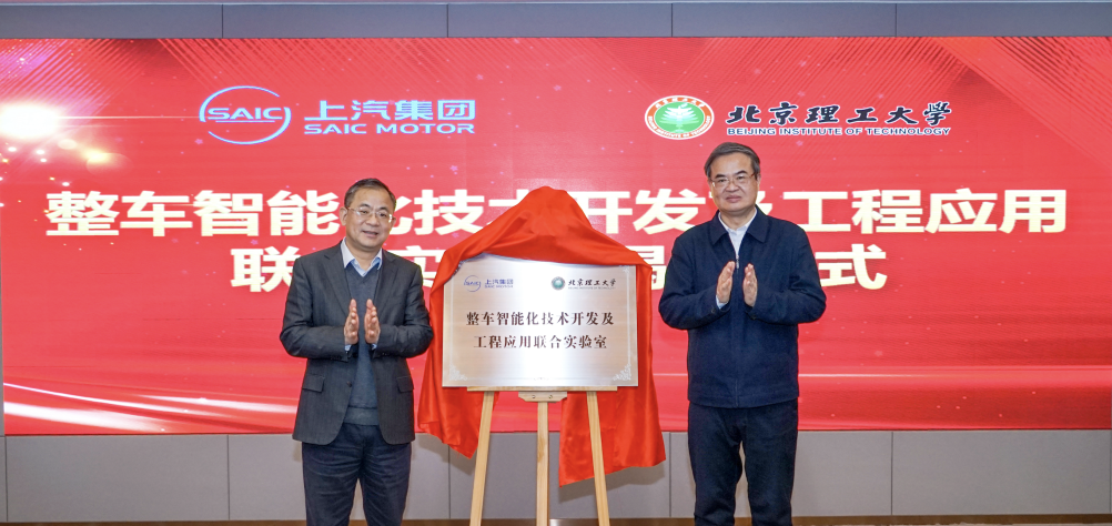 上汽集團(tuán)董事長(zhǎng)王曉秋和北京理工大學(xué)黨委書記張軍為“整車智能化技術(shù)開發(fā)及工程應(yīng)用聯(lián)合實(shí)驗(yàn)室”揭牌