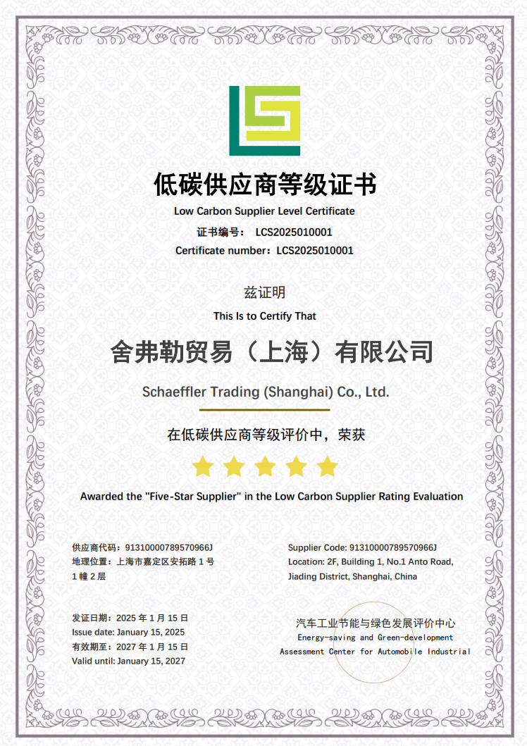 1月15日,舍弗勒憑借在碳管理及脫碳行動方面的卓越表現,榮獲由汽車工業節能與綠色發展評價中心授予的2025年汽車行業低碳供應商評價“五星企業”稱號,成為汽車行業首家獲得此最高評級的供應鏈企業。