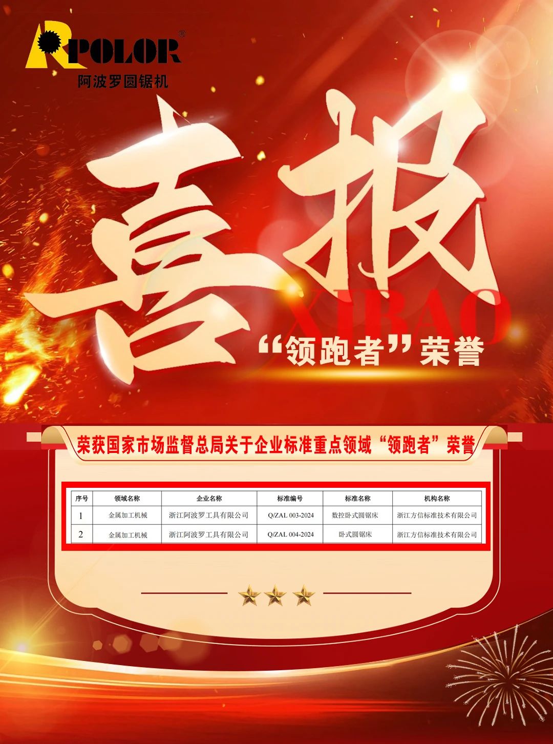 中國標準化研究院關(guān)于發(fā)布2024年企業(yè)標準“領(lǐng)跑者”名單的公告,浙江阿波羅工具有限公司兩項圓鋸機相關(guān)標準榮獲企業(yè)標準“領(lǐng)跑者”稱號。