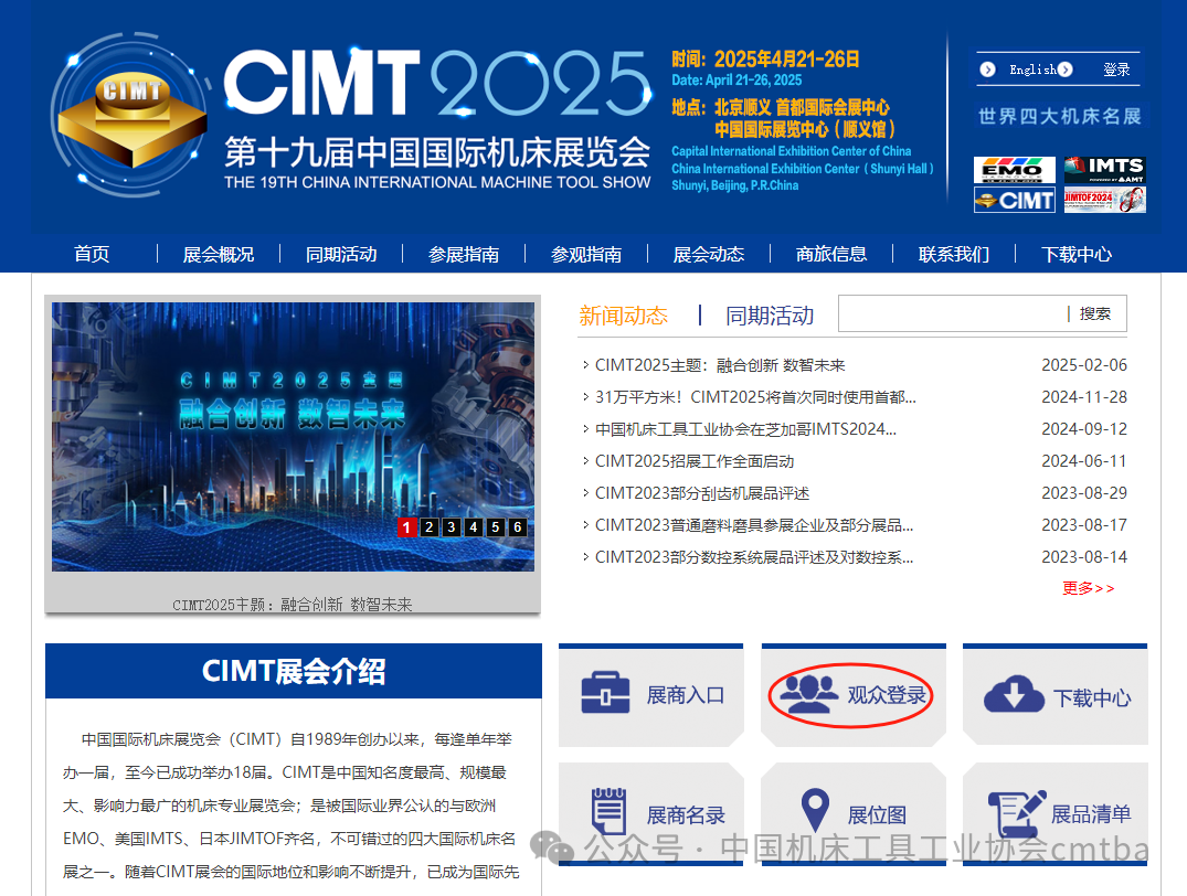 第十九屆中國國際機床展覽會(CIMT2025)觀眾入場證線上登錄系統(tǒng)已開放,境內外觀眾均可登錄該系統(tǒng)自行注冊辦理“觀眾入場證”。