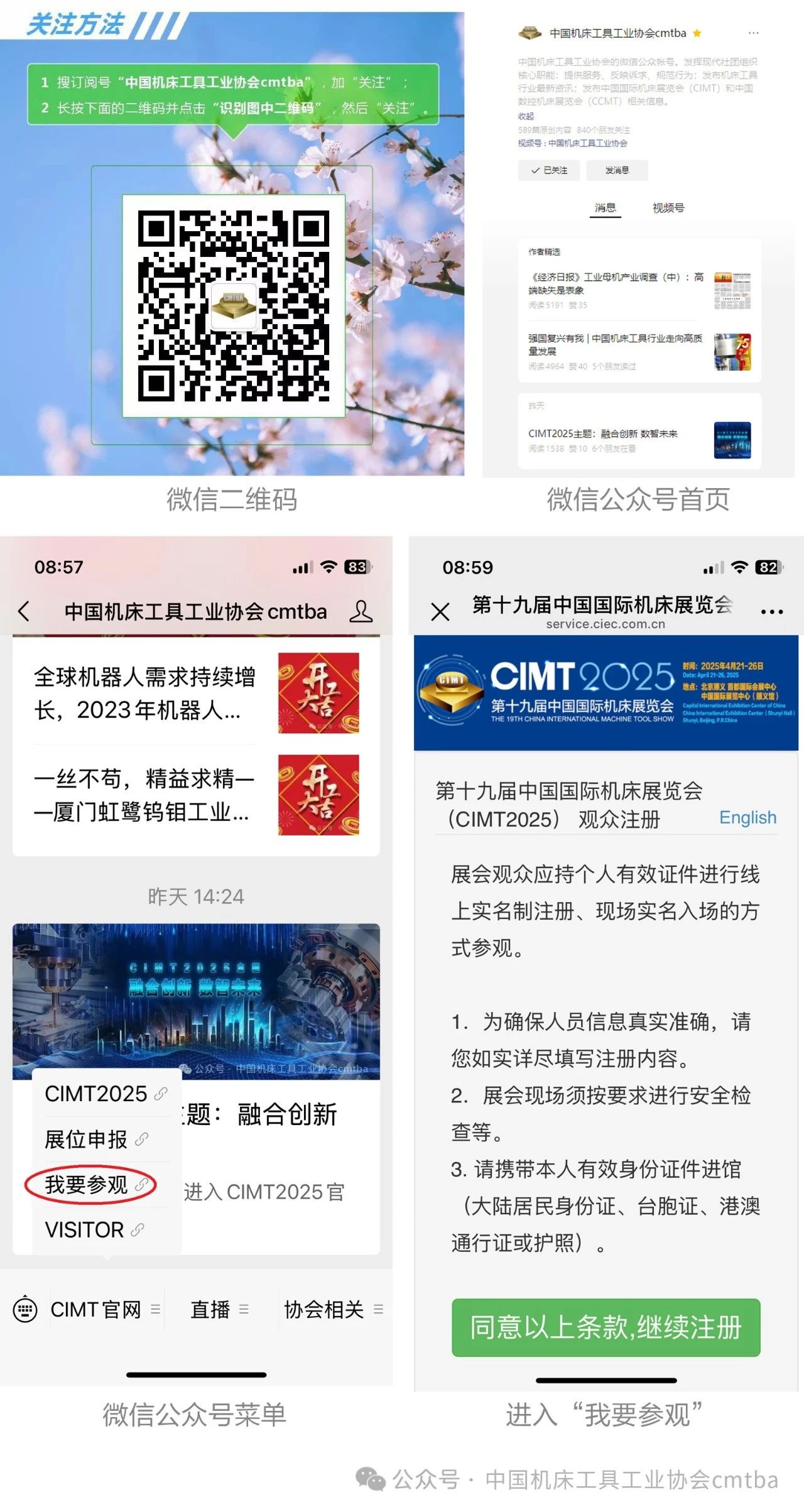 關注“中國機床工具工業(yè)協(xié)會cmtba”微信訂閱號, 點擊下方菜單“CIMT官網(wǎng)”中“我要參觀”,進入菜單并注冊成功后,可在展會現(xiàn)場自助機打印入場證。