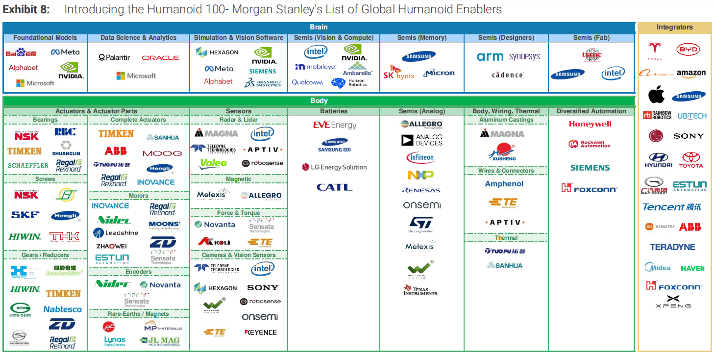 摩根士丹利將人形機器人產業鏈拆分為三大核心環節,分別為“大腦”、“身體”和“集成”,首次對鏈上100家核心上市公司進行系統梳理。