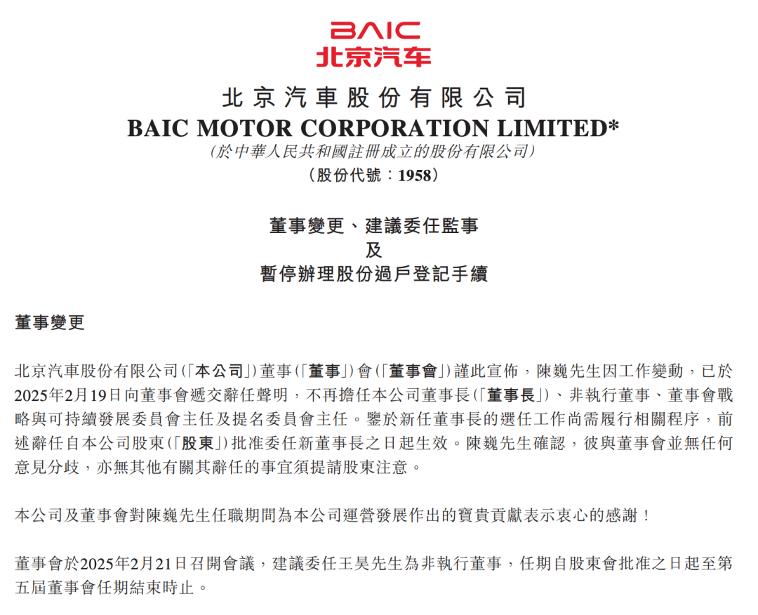 2022年5月,姜德義申請辭去北汽汽車董事長、非執行董事、董事會戰略委員會主任及提名委員會主任的職務,陳巍則接替他的職務成為北汽汽車董事長,同時擔任著北汽集團總經理助理一職。2024年3月27日,北汽集團召開干部大會宣布,張建勇任北汽集團黨委書記、董事長,姜德義到齡退休。在張建勇到任后,陳巍又被任命為北汽集團副總經理,試用期為一年。從目前來看,陳巍因為工作變動而辭職,其調任北汽極狐(前北汽藍谷)擔任董事長。