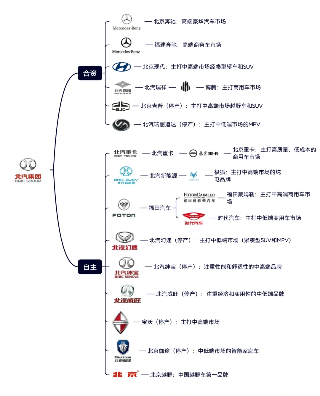 北汽集團的品牌資產大致可以分為兩大上市公司,一是港股上市公司北京汽車,是北京汽車股份有限公司的上市公司,旗下品牌包括北京汽車、北京奔馳、北京現代等,另一家則是于上交所上市的北汽藍谷,是北汽藍谷新能源科技股份有限公司的上市公司,旗下品牌包括北汽新能源、極狐汽車、享界。