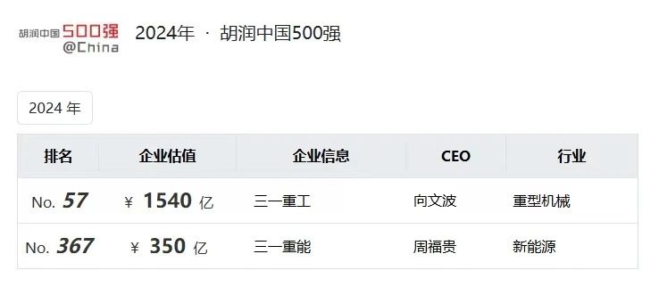 在本次榜單中,三一重工以1540億元的市值位列第57名,較前一年上升了23位,成功達到2024胡潤全球高質(zhì)量企業(yè)TOP1000的1400億元門檻,成為排名最高的重型機械公司。同時,三一重能以350億元市值位居第367位,連續(xù)第三年躋身榜單。
