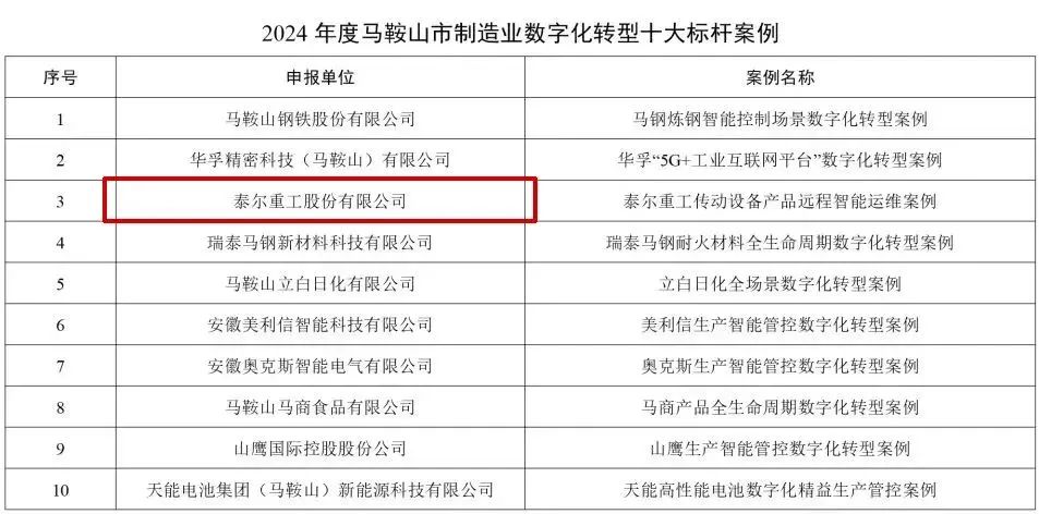 此次入選十大案例,標志著泰爾數字化轉型成果獲得政府與行業的高度認可。作為冶金行業裝備制造領域領軍企業之一,泰爾將持續深化數字技術與實體制造的融合創新,助力馬鞍山打造全國智慧制造新高地,為制造業高質量發展貢獻力量。