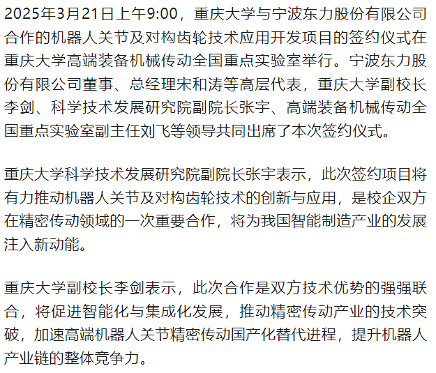 2025年3月21日上午9:00,重慶大學與寧波東力股份有限公司合作的機器人關節及對構齒輪技術應用開發項目的簽約儀式在重慶大學高端裝備機械傳動全國重點實驗室舉行。