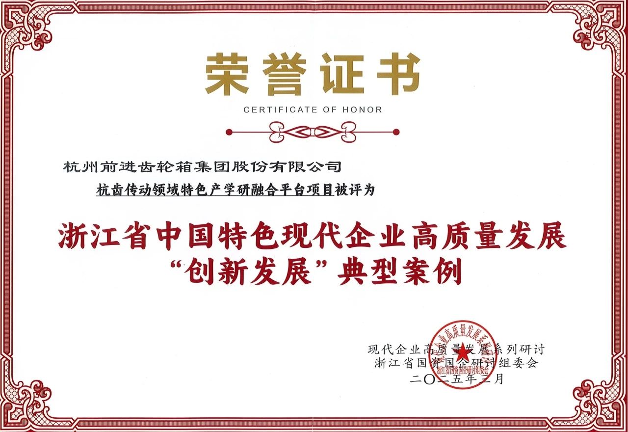 杭齒集團傳動領域特色產學研融合平臺相關案例入選,并被評為浙江省中國特色現代企業(yè)高質量發(fā)展“創(chuàng)新發(fā)展”典型案例。