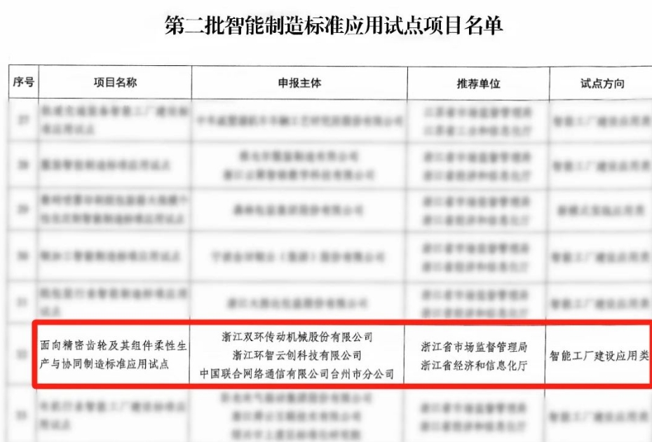 近日,國(guó)家標(biāo)準(zhǔn)化管理委員會(huì)與工業(yè)和信息化部聯(lián)合發(fā)布了《第二批智能制造標(biāo)準(zhǔn)應(yīng)用試點(diǎn)項(xiàng)目名單》,雙環(huán)傳動(dòng)及其子公司環(huán)智云創(chuàng)聯(lián)合中國(guó)聯(lián)通臺(tái)州分公司申報(bào)的項(xiàng)目《面向精密齒輪及其組件柔性生產(chǎn)與協(xié)同制造標(biāo)準(zhǔn)應(yīng)用試點(diǎn)》成功上榜。這標(biāo)志著雙環(huán)及其子公司環(huán)智云創(chuàng)在智能制造領(lǐng)域的創(chuàng)新能力與技術(shù)實(shí)力獲得高度認(rèn)可。