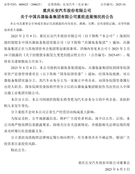 長安汽車公告,2025年6月4日,公司接到兵器裝備集團(tuán)通知,兵器裝備集團(tuán)收到國務(wù)院國有資產(chǎn)監(jiān)督管理委員會(huì)通知,經(jīng)國務(wù)院批準(zhǔn),對(duì)兵器裝備集團(tuán)實(shí)施分立。其汽車業(yè)務(wù)分立為一家獨(dú)立中央企業(yè),由國務(wù)院國資委履行出資人職責(zé);國務(wù)院國資委按程序?qū)⒎至⒑蟮谋餮b備集團(tuán)股權(quán)作為出資注入中國兵器工業(yè)集團(tuán)有限公司。本次分立后,本公司間接控股股東將變更為汽車業(yè)務(wù)分立的中央企業(yè),實(shí)際控制人未發(fā)生變化。東風(fēng)股份6月5日早間公告,2025年2月9日,公司接到間接控股股東東風(fēng)汽車集團(tuán)有限公司(以下簡(jiǎn)稱“東風(fēng)公司”)通知,東風(fēng)公司正在與其他國資央企集團(tuán)籌劃重組事項(xiàng)。2025年6月4日,公司接到間接控股股東東風(fēng)公司通知,東風(fēng)公司暫不涉及相關(guān)資產(chǎn)和業(yè)務(wù)重組。本公司正常生產(chǎn)經(jīng)營活動(dòng)不會(huì)受到影響。