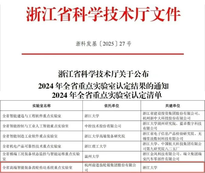 近日,浙江省科學技術廳公布了2024年全省重點實驗室認定結果,由杭州前進齒輪箱集團股份有限公司牽頭,浙江大學聯合共建的 “全省高端智能裝備齒輪傳動系統重點實驗室” 成功取得認定。