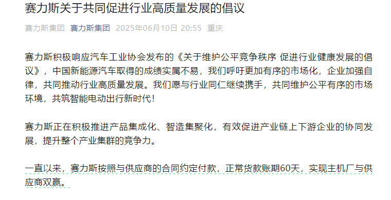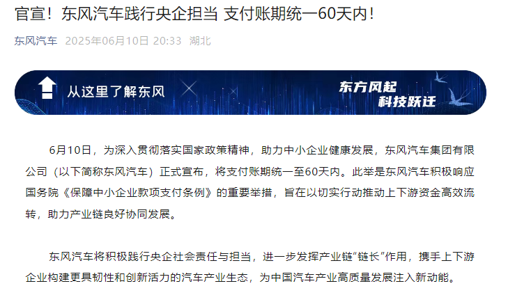6月10日晚,東風(fēng)汽車、廣汽集團(tuán)、中國一汽、賽力斯等多家車企分別發(fā)表聲明,就“支付賬期不超過60天”作出承諾。。
