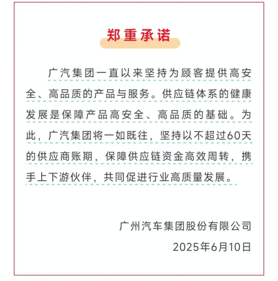 同一天,廣汽集團(tuán)發(fā)布關(guān)于供應(yīng)商賬期的鄭重承諾稱:“供應(yīng)鏈體系的健康發(fā)展是保障產(chǎn)品高安全、高品質(zhì)的基礎(chǔ)。為此,廣汽集團(tuán)將一如既往,堅持以不超過60天的供應(yīng)商賬期,保障供應(yīng)鏈資金高效周轉(zhuǎn),攜手上下游伙伴,共同促進(jìn)行業(yè)高質(zhì)量發(fā)展。”