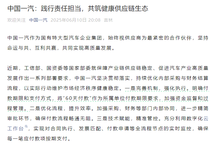 國內(nèi)車企集體發(fā)聲,是響應(yīng)2025年6月1日施行的《保障中小企業(yè)款項支付條例》。該條例核心內(nèi)容包括明確60日支付期限、禁止強(qiáng)制接受商業(yè)匯票等非現(xiàn)金支付方式、強(qiáng)化協(xié)同監(jiān)管體系等,旨在解決中小企業(yè)賬款拖欠問題,優(yōu)化營商環(huán)境 。工業(yè)和信息化部黨組書記、部長李樂成近日主持召開黨組會議,要求扎實推進(jìn)“綜合整治新能源汽車行業(yè)‘內(nèi)卷’問題”等3項集中整治。行業(yè)呼吁反內(nèi)卷,政府部門對癥下藥逐條反內(nèi)卷,規(guī)定支付供應(yīng)商賬期正是具體措施之一。