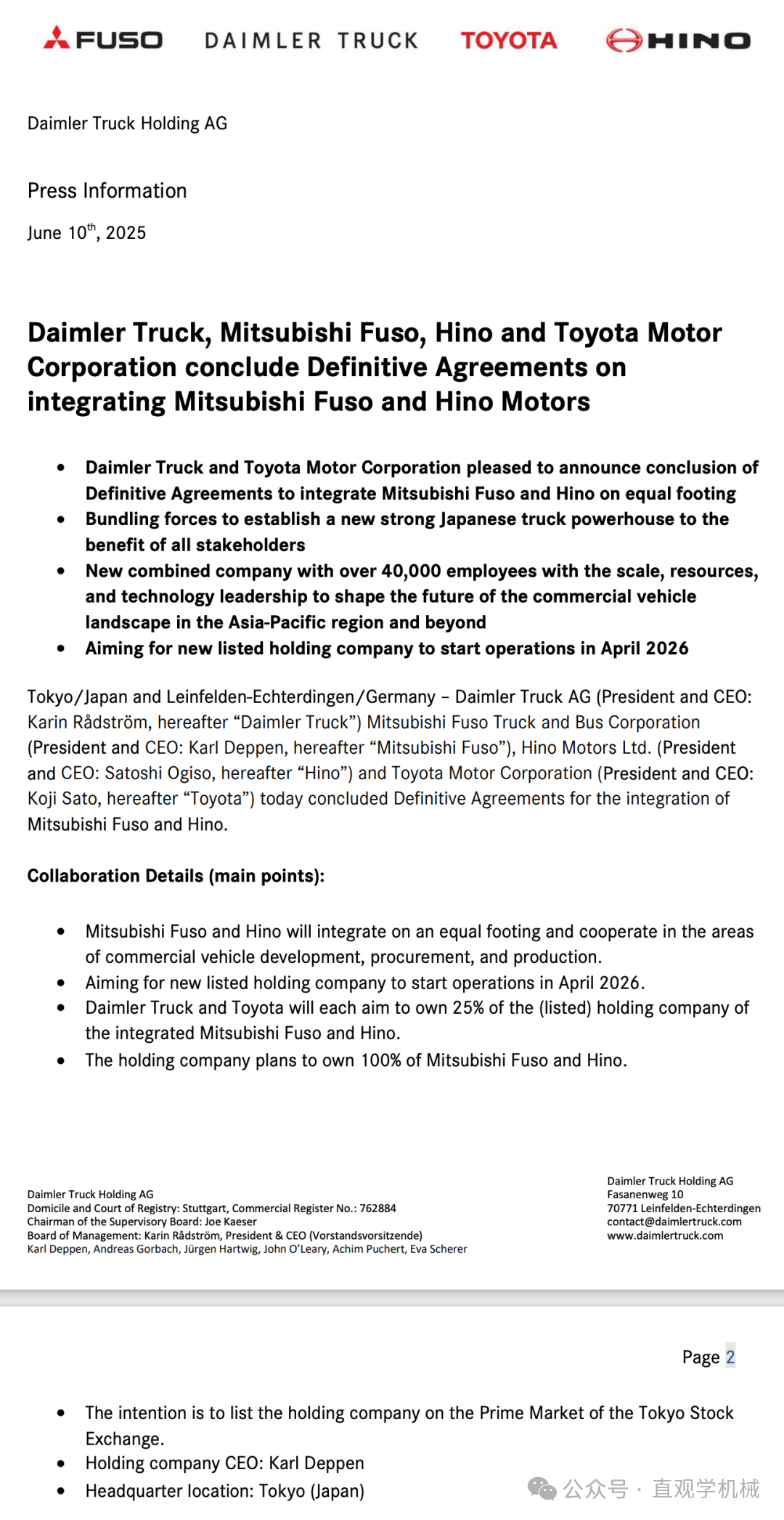 其實,早在2023年5月,豐田、日野汽車、戴姆勒卡車、三菱扶桑4家公司就2024年底之前統合業務達成基本協議。然而,原本計劃在2024年2月簽署最終協議,卻因為日野汽車的發動機認證造假一事不得不被迫無限期推遲,時間來到2025年,事情出現轉機,雙方重啟合并談判,4月份的時候多家日媒就透露豐田、日野汽車、戴姆勒卡車、三菱扶桑就業務整合基本確定,并最早有望在5月簽署最終協議,雖然最終時間遲了一個月,但總算是定了下來。