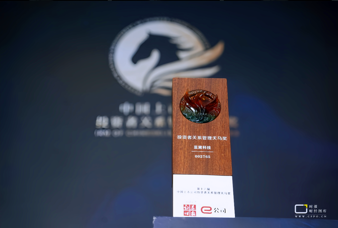 6月13日,由證券時報社主辦的第十六屆“天馬獎”頒獎盛典在江蘇揚州隆重舉行,藍黛科技憑借優異的投資者關系管理工作,從數千家上市公司中脫穎而出,榮獲“中國上市公司投資者關系管理天馬獎”殊榮。這一獎項的獲得,充分體現了資本市場對公司投資者關系管理工作的肯定和高度認可。