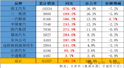 福田汽車?yán)垆N5027輛,同比增長284.6%,市占率為8.2%,份額較同期減少0.2個(gè)百分點(diǎn)。東風(fēng)累銷4403輛位列前七,同比增長207.0%,市占率為7.2%,份額較同期減少2個(gè)百分點(diǎn)。遠(yuǎn)程位列第八位,累銷2984輛,同比增長141.0%,市占率為4.9%。