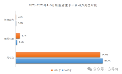 從新能源重卡動力類型來看,純電動及混動占比較去年有所提升。1-5月份,純電動重卡銷量5.9萬輛,結(jié)構(gòu)占比為97.7%,較2024年增長3%。