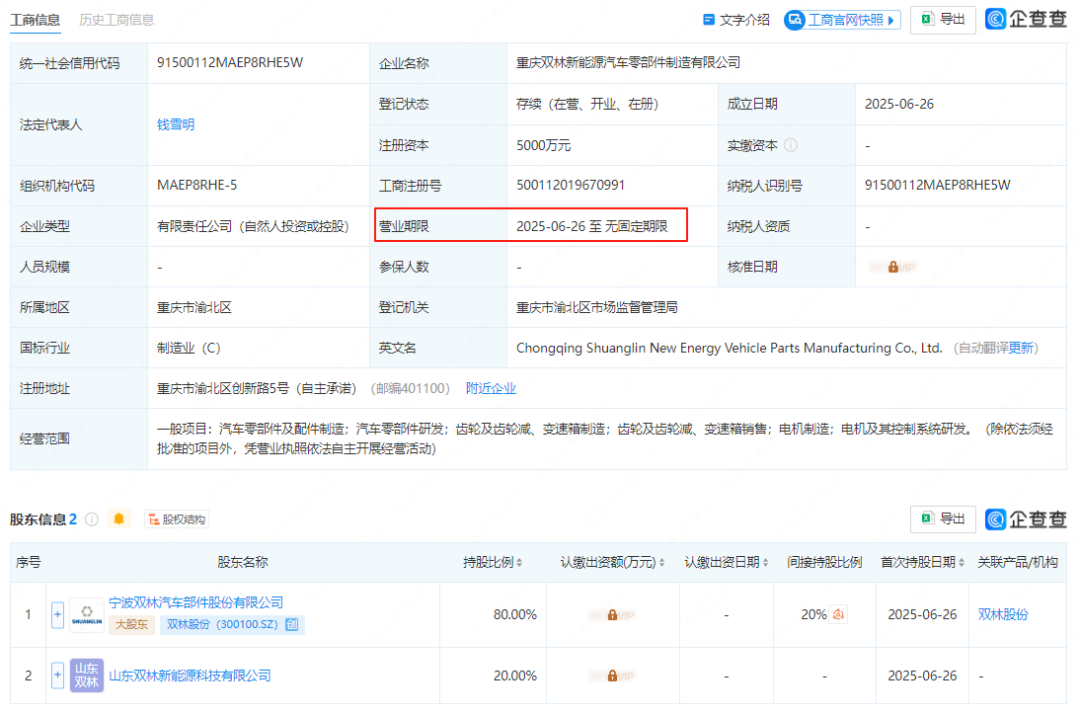 企查查APP顯示,2025-06-26,重慶雙林新能源汽車零部件制造有限公司成立,注冊資本5000萬元,經營范圍包含:汽車零部件及配件制造;汽車零部件研發;齒輪及齒輪減、變速箱制造等。企查查股權穿透顯示,該公司由雙林股份(300100)間接全資持股。