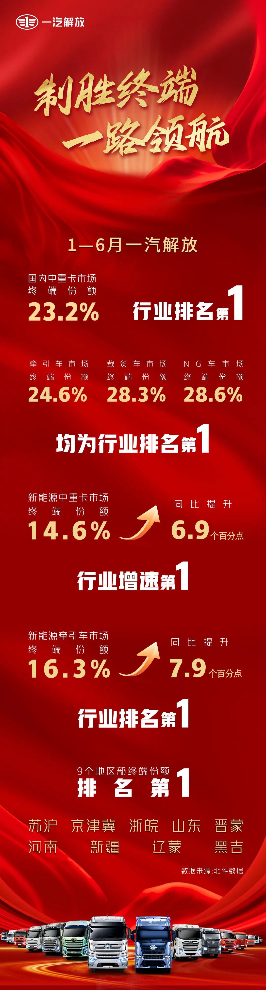 一汽解放1-6月中重卡終端份額23.2%,行業第一!