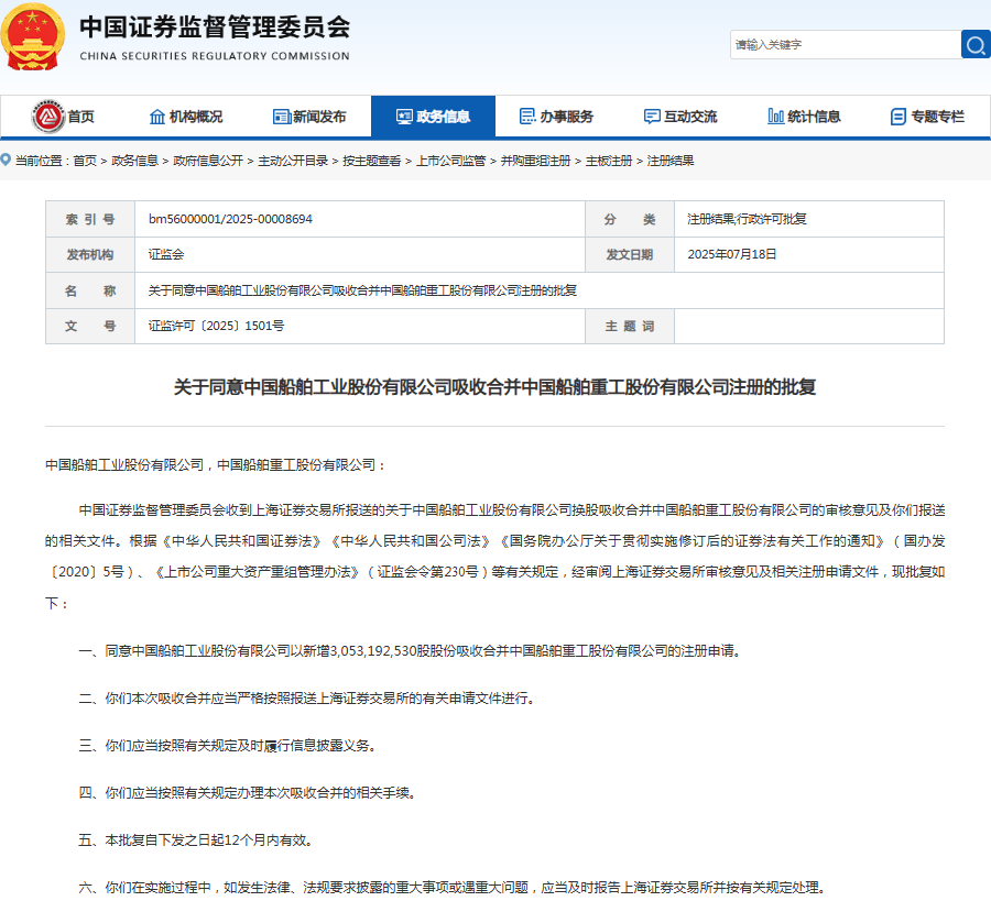 距離上交所審核通過剛過去兩周,“兩船合并”又迎來重要進展:近日,中國證監(jiān)會發(fā)布公告,同意中國船舶換股吸收合并中國重工。