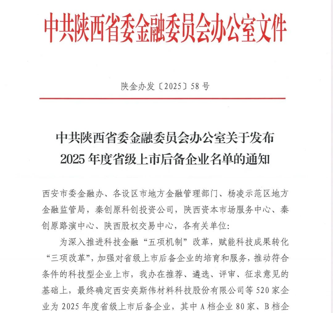 近日,中共陜西省委金融委員會(huì)辦公室正式發(fā)布 2025 年度省級(jí)上市后備企業(yè)名單,西安鐳射傳動(dòng)科技有限公司憑借在高端裝備制造領(lǐng)域的技術(shù)實(shí)力與發(fā)展?jié)摿Γ晒θ脒x C 檔企業(yè)名單。此次入選不僅是對(duì)公司綜合實(shí)力的認(rèn)可,更是陜西省推進(jìn)科技金融 “五項(xiàng)機(jī)制” 改革、賦能科技成果轉(zhuǎn)化 “三項(xiàng)改革” 的具體實(shí)踐,將為公司加速登陸資本市場(chǎng)注入強(qiáng)勁動(dòng)力。