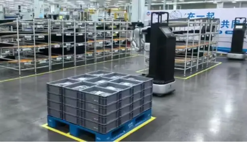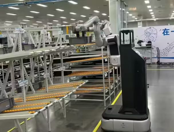 此次合作采用“具身機器人 + AMR”構建了深度協同系統,其中具身機器人 A2-W 負責多層料架周轉箱取放,AMR 負責車間內重載整托物料運輸。依托生產系統的智能派單與動態叫料機制,AMR 將物料從揀選室配送至線邊上料點,具身機器人 A2-W 可自動識別箱體、自主調整姿態,完成拆垛上料及空箱回收,實現從物料出庫、產線上料、空箱回收流轉的全流程作業。