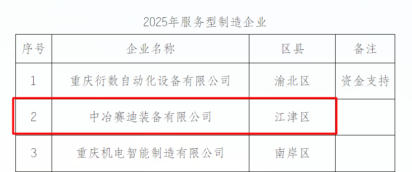 8月11日,中冶賽迪裝備有限公司申報(bào)的"綠色冶金與高端裝備服務(wù)型制造企業(yè)"通過重慶市經(jīng)濟(jì)和信息化委員會(huì)審批,成功入選重慶市2025年服務(wù)型制造企業(yè)。這標(biāo)志著中冶賽迪裝備在科技創(chuàng)新、研發(fā)中試、制造型服務(wù)業(yè)建設(shè)以及服務(wù)行業(yè)產(chǎn)業(yè)轉(zhuǎn)型升級(jí)方面取得階段性成果。