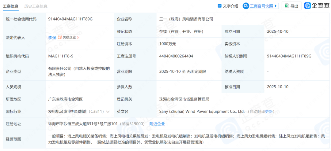中國風電新聞網訊:企查查App顯示,10月10日,三一(珠海)風電裝備有限公司成立,法定代表人為李強,注冊資本1000萬元,由三一重能全資持股。