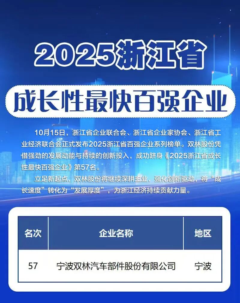 10月15日,浙江省企業聯合會、浙江省企業家協會、浙江省工業經濟聯合會正式發布2025浙江省百強企業系列榜單。雙林股份憑借強勁的發展動能與持續的創新投入,成功躋身《2025浙江省成長性最快百強企業》第57名。